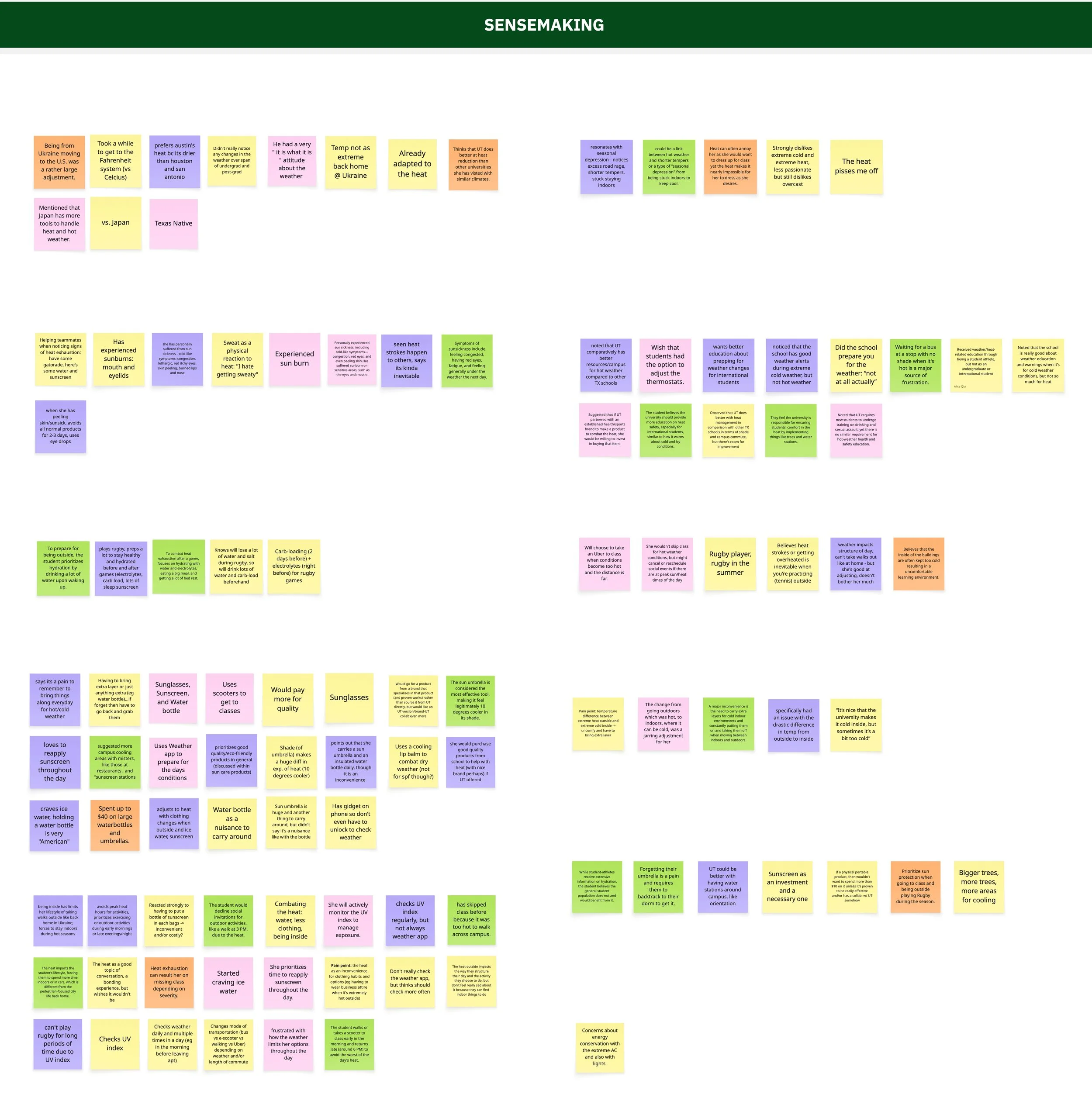 With a range of perspectives gathered, we began organizing patterns across conversations. Using Miro, we clustered recurring themes and prioritized the insights that most consistently shaped students’ experiences. This process transformed scattered observations into a shared understanding of where design intervention could have the greatest impact.