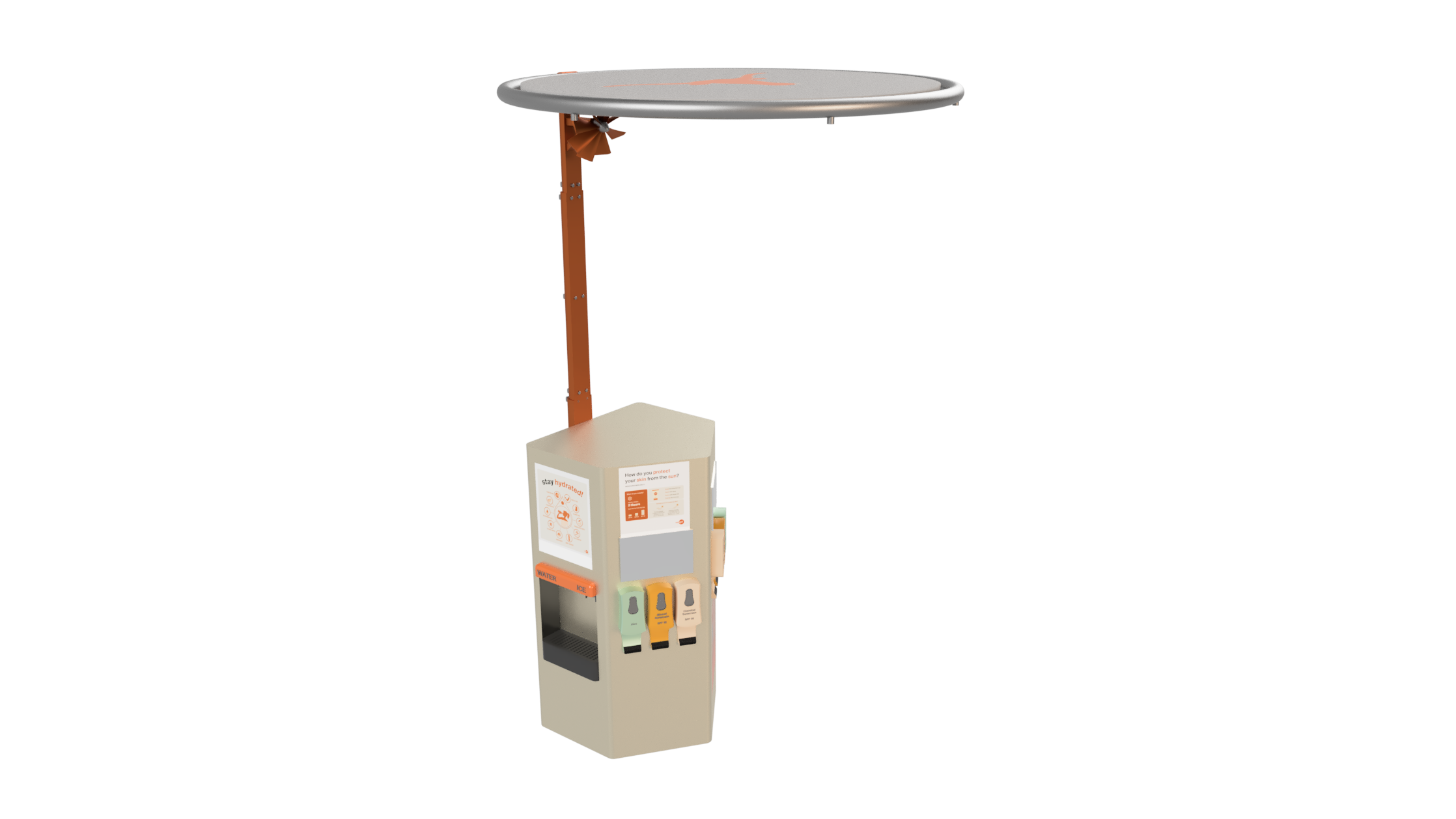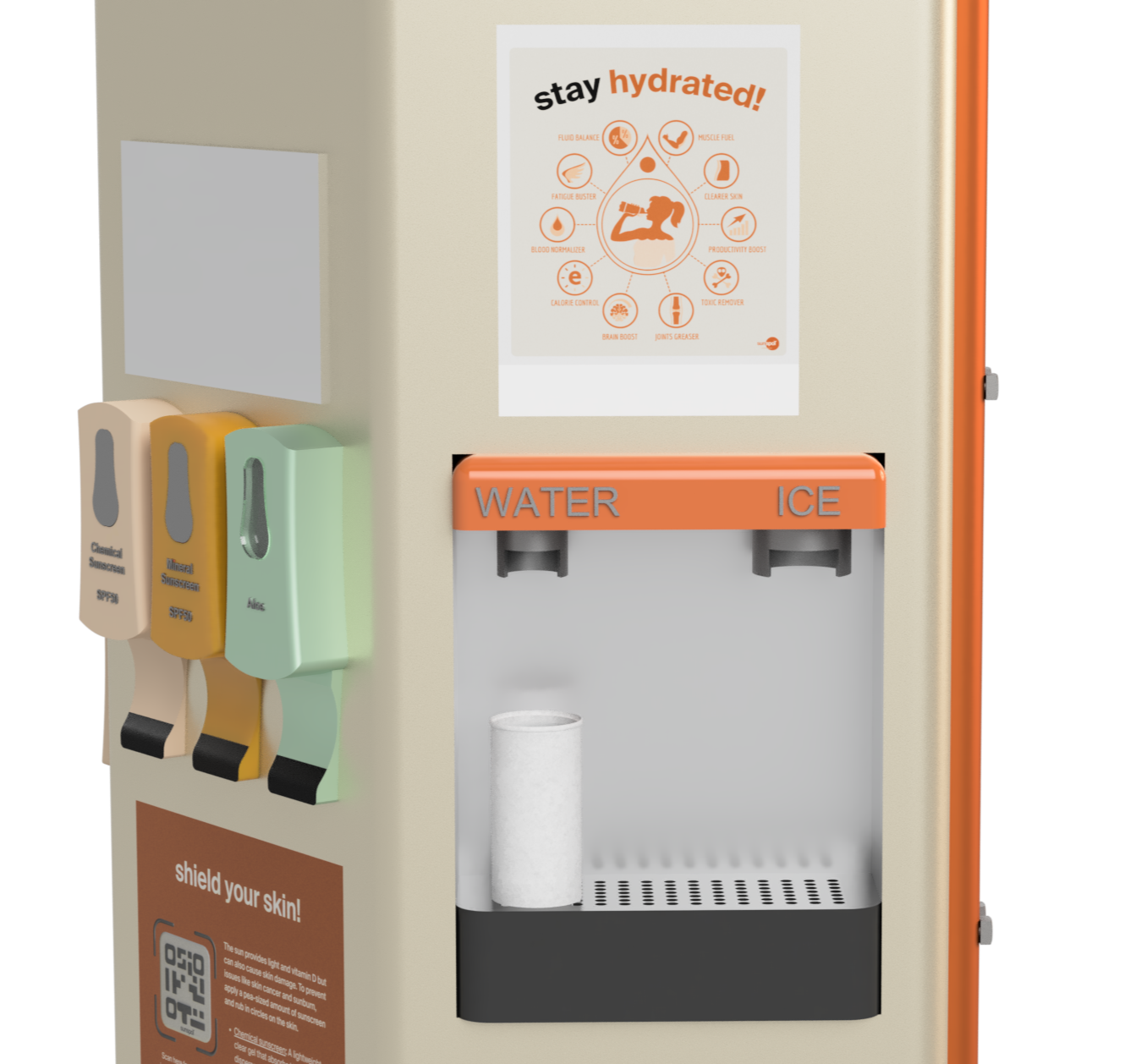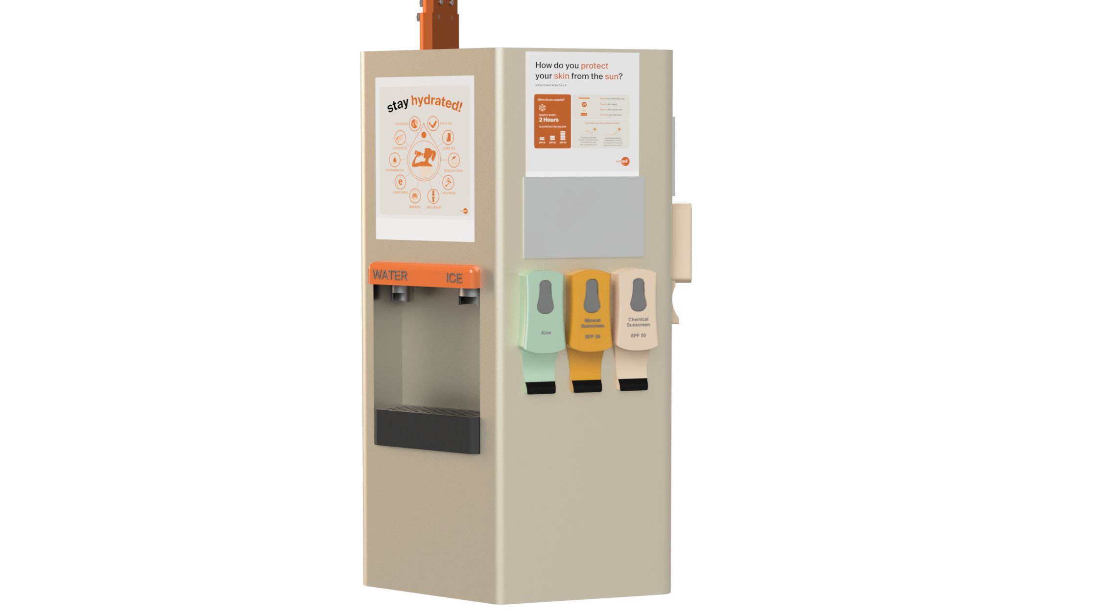 SunSpot is a freestanding modular cooling station placed along high-traffic pedestrian routes across campus. Each unit provides a shaded canopy overhead and houses resources designed to keep students healthy in extreme heat — including mineral and regular sunblock options, varying levels of water and ice refills to support hydration, and signage with guidance on recognizing and preventing heat-related illness.