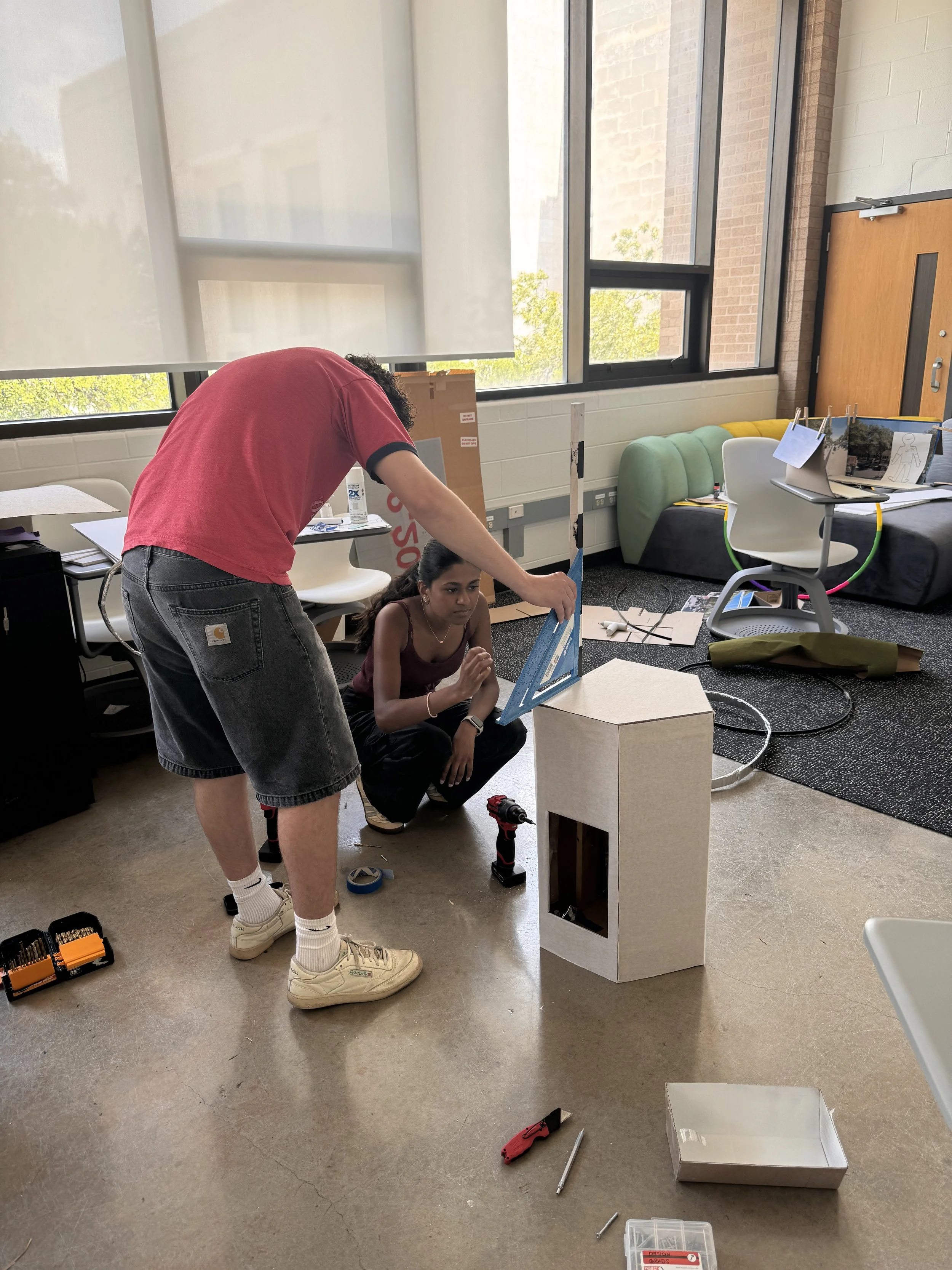 In the studio, we constructed physical prototypes from cardboard and scrap materials, working through the form and scale of a freestanding cooling station. Simultaneously, we dropped rough 3D models into photos of actual campus locations to test how the structure might sit within real pedestrian corridors. These weren't meant to be beautiful — they were meant to provoke questions. Could it provide enough coverage? Would students actually stop and use it? What resources would make the biggest difference in the moment?