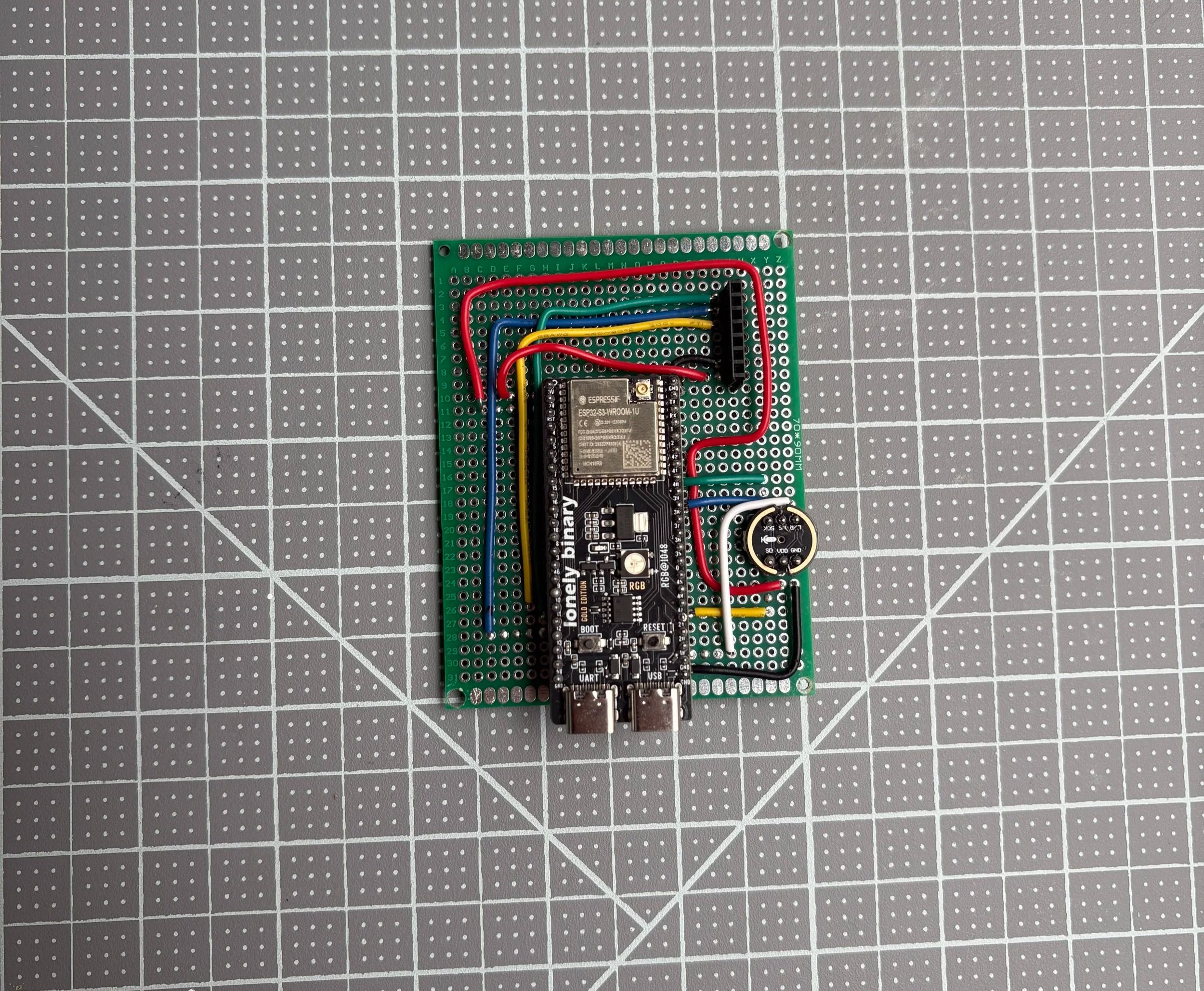 With my schematic mapped out, I moved into fabrication, transferring the design onto the perfboard and hand-soldering each connection according to it. It's a more hands-on approach than sending a board out for manufacturing, but it lets me build and test quickly while staying close to the hardware.