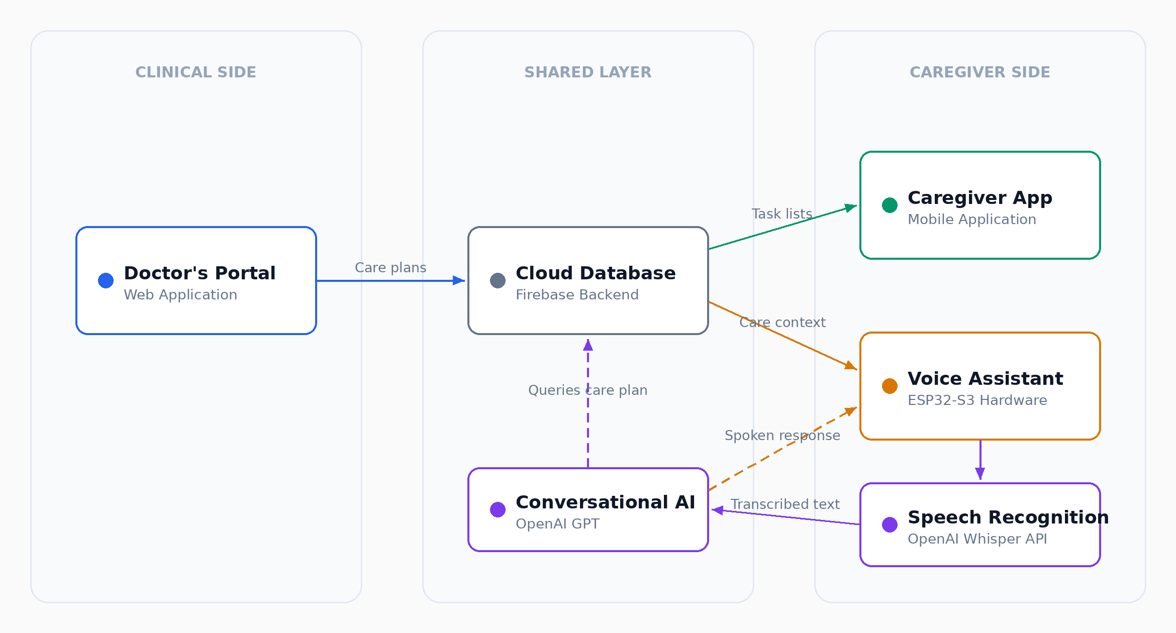 Built in React, the Doctor's Portal lets clinicians create and manage patient profiles, build biweekly care plans, and set medication schedules with dosages and timing. Everything entered here becomes the single source of truth that powers both the Caregiver App and the Voice Assistant.