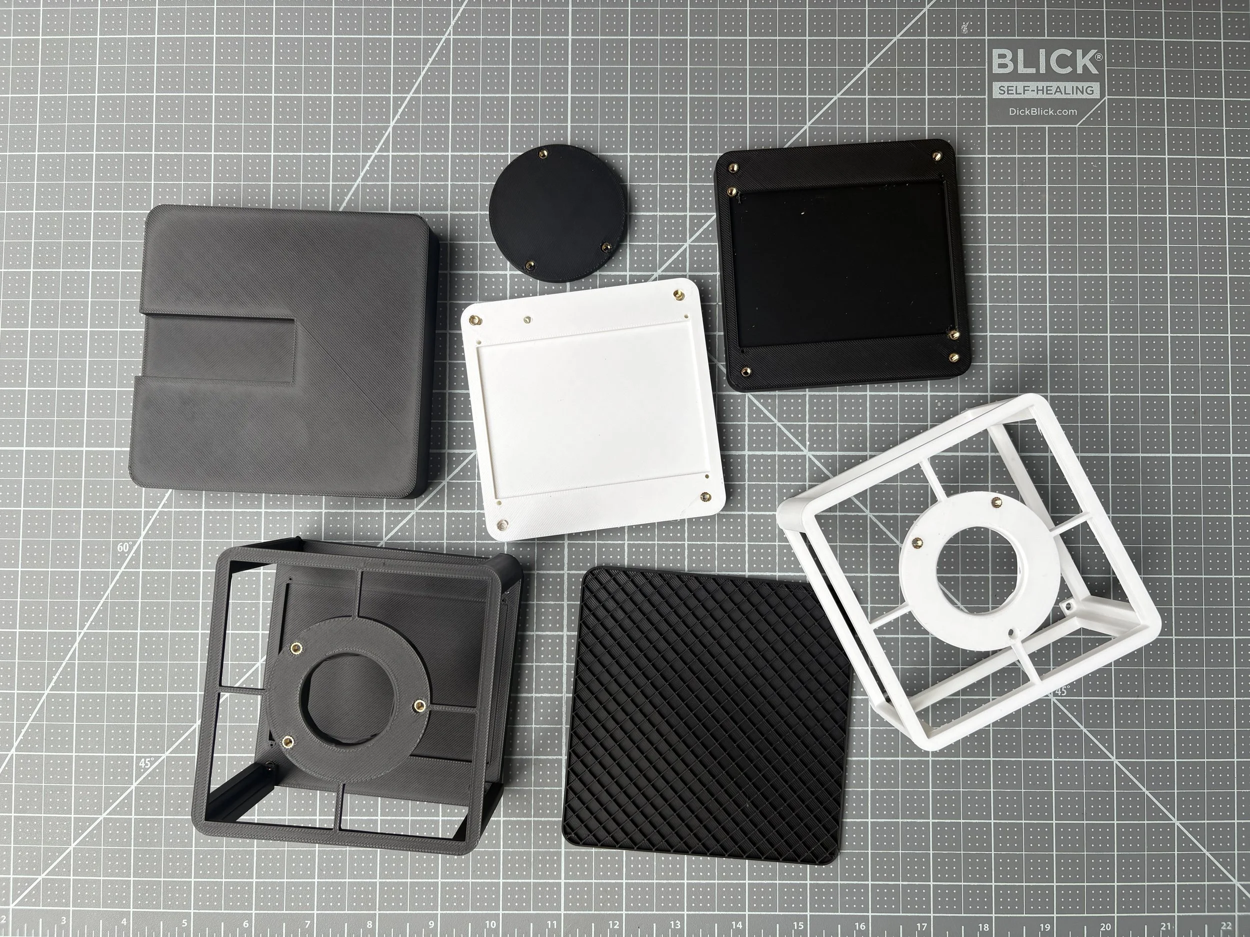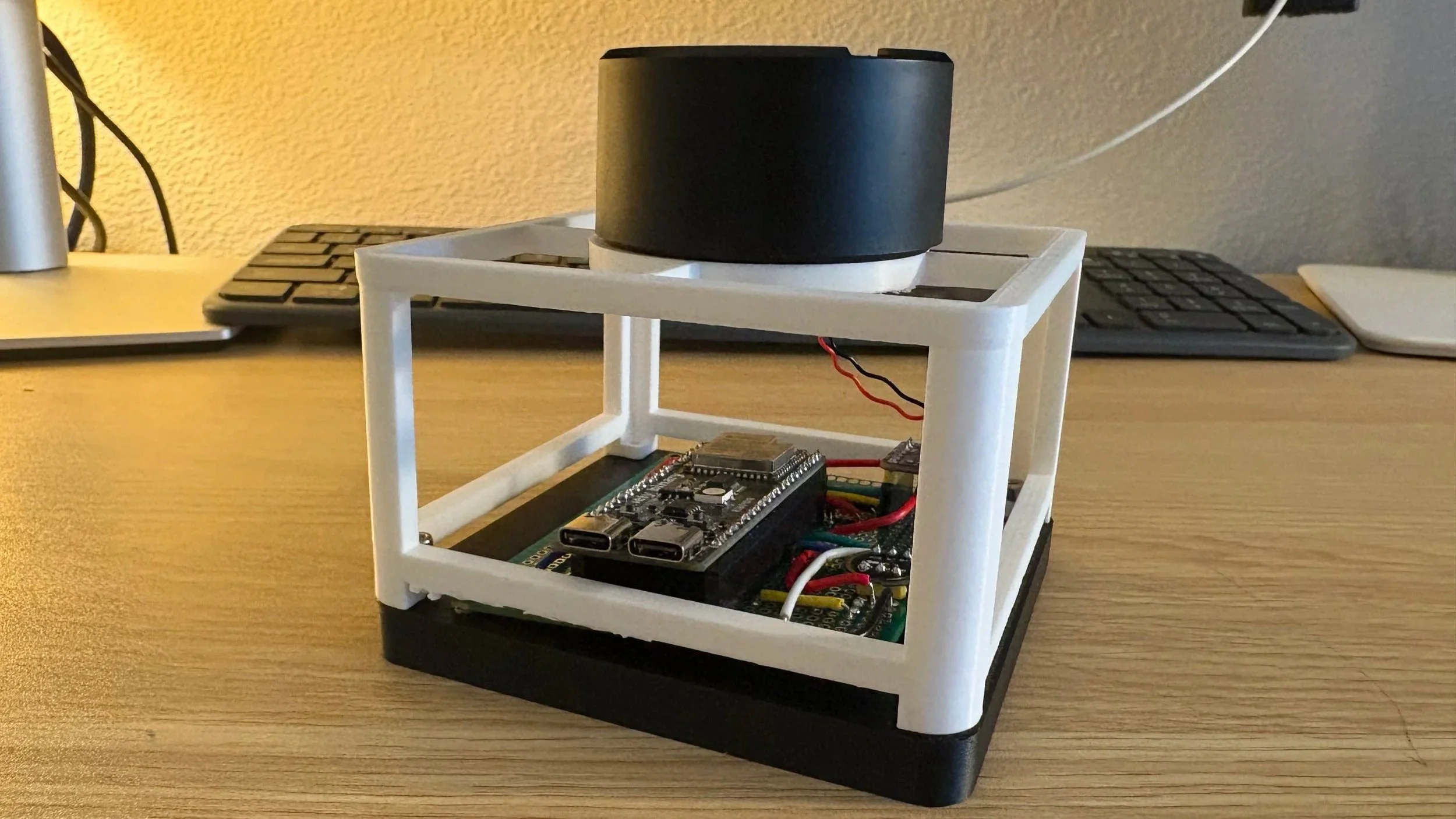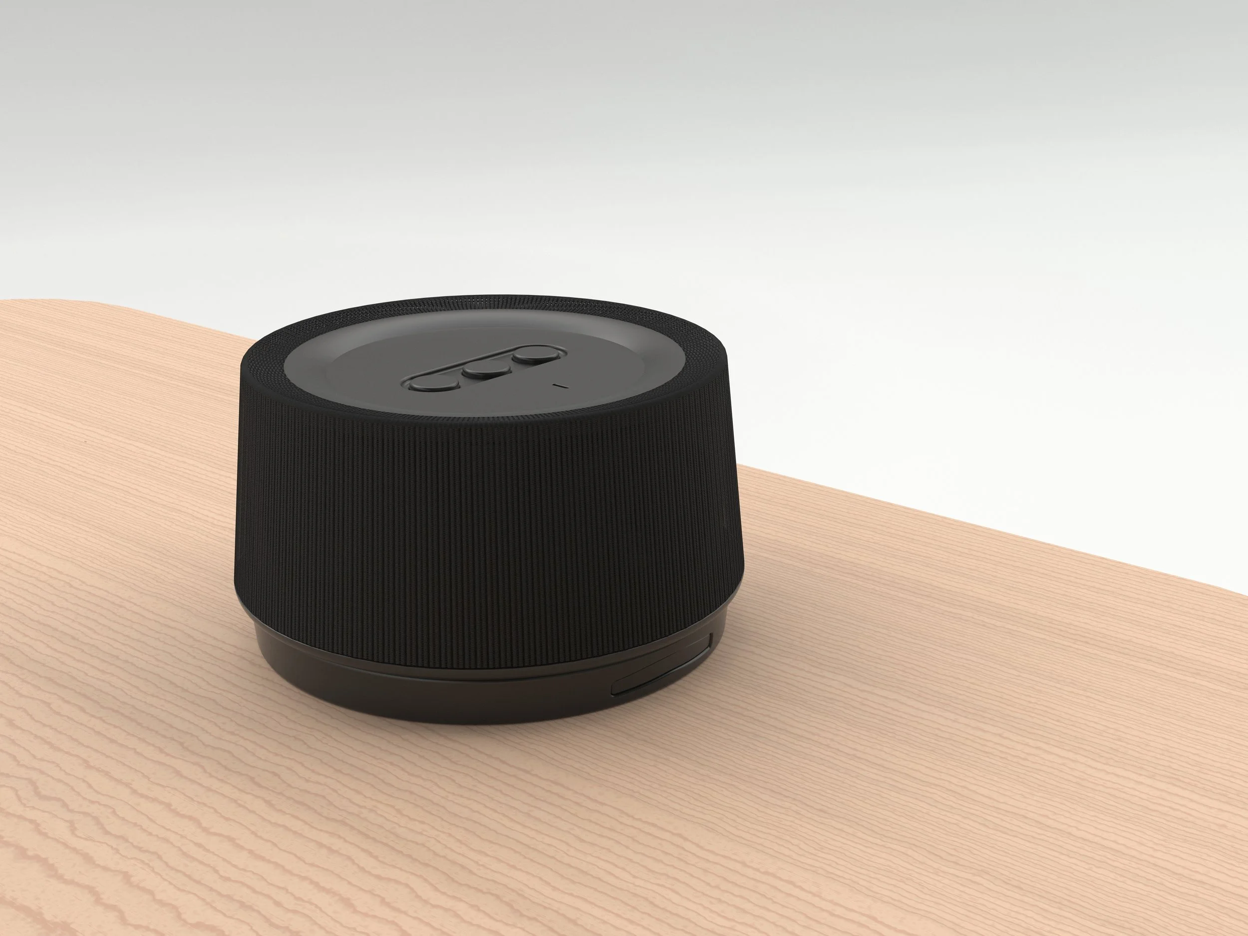 This is my most recent prototype housing, 3D-printed and assembled, with the perfboard PCB seated in the base and the speaker mounted on top. From here, I'm working toward a higher fidelity version that gets closer to the fit, finish, and form of the final design