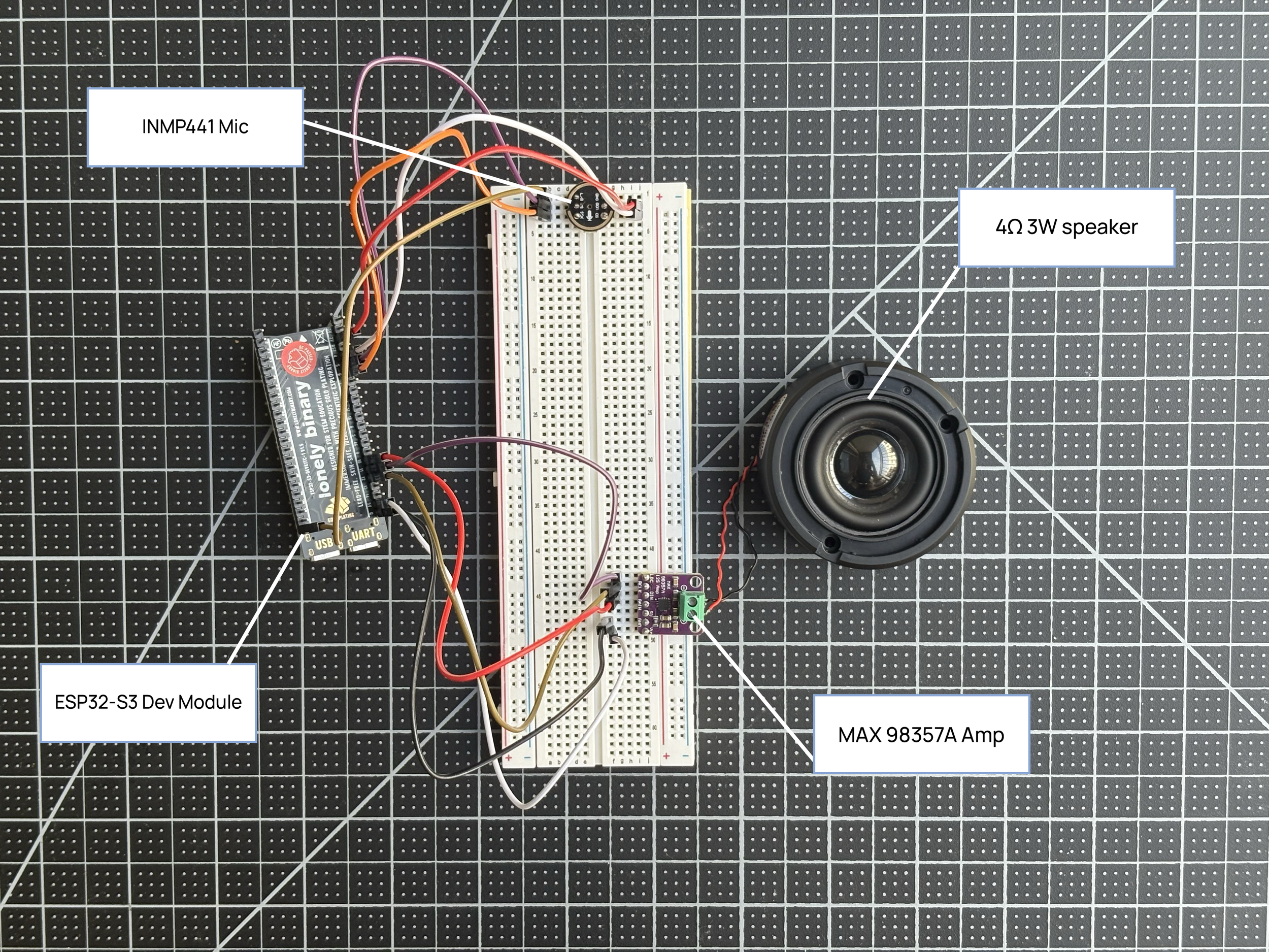 I built a breadboard prototype using an ESP32-S3 dev module, an INMP441 microphone for voice input, a MAX 98357A amplifier, and a 4Ω 3W speaker for audio output. The device captures a caregiver's spoken question, sends the audio to OpenAI's Whisper API for transcription, and then passes the resulting text, along with the patient's care plan, to a conversational AI model. The response comes back as plain language, not clinical jargon.